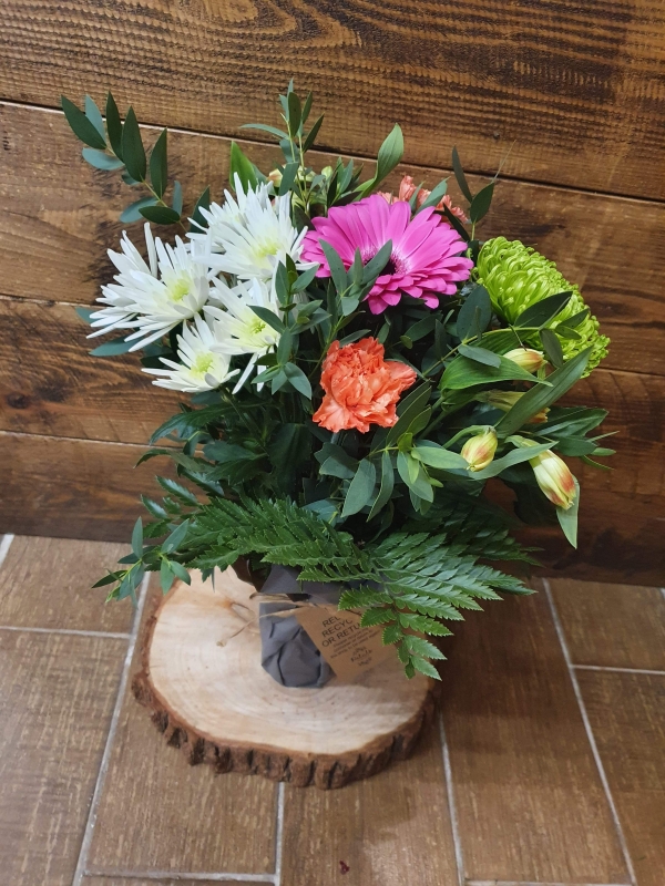 A jam jar filled with beautiful flowers.... our new design to go with our new Eco friendly theme! A selection of flowers arranged in a paper wrapped jar which can be popped in the recycling once finished with or to be used again! (Colours and flowers will be done in florist choice)