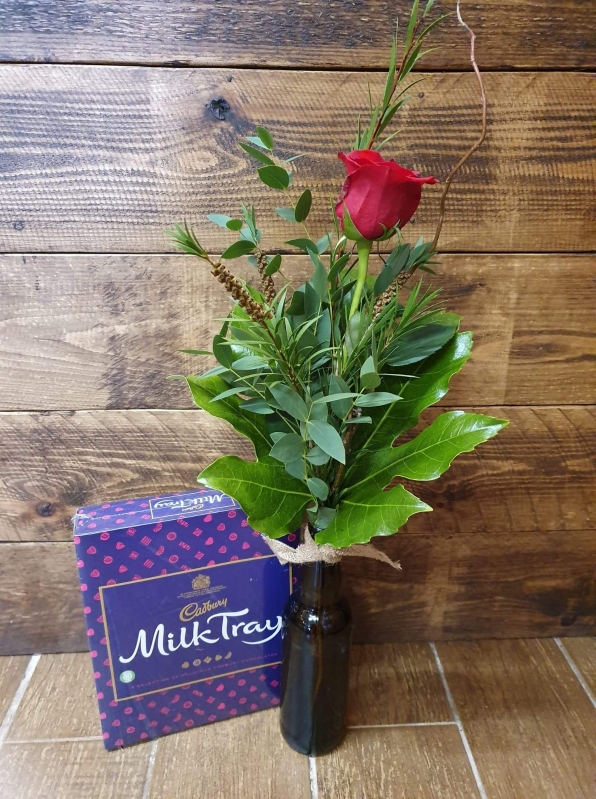 The Eco friendly Valentines gift! Single Red rose in a beer bottle.....a perfect little something for your fella.... or lady! The beer bottle can be put in the recycling one you've finished with it....