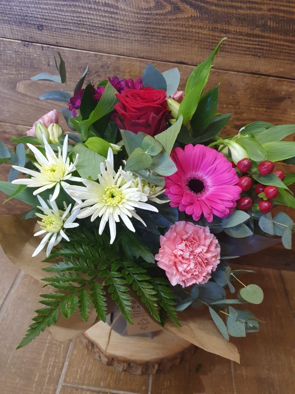 Our ever popular flower filled jars with a Red rose to celebrate Valentines day! A mix of flowers in pinks, reds and creams with a red rose in the middle, comes arranged in a paper wrapped jar which can be recycled after use meaning its friendlier to the environment too!