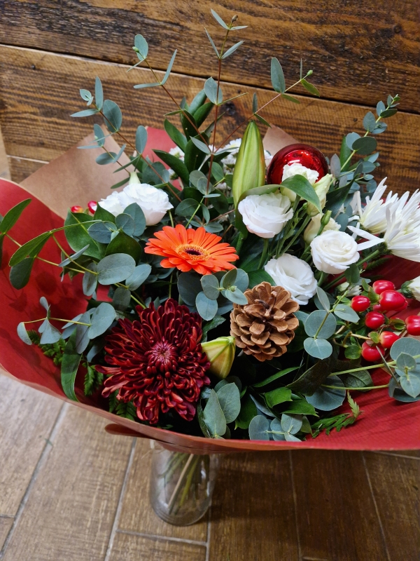 A mixture of beautiful and seasonal flowers with a bit of Christmas included.....selected by the florist on the day. Hand tied ready to pop into a vase at home. Wrapped in paper. Please note colours and flowers will vary. Will include a Christmas accessories.