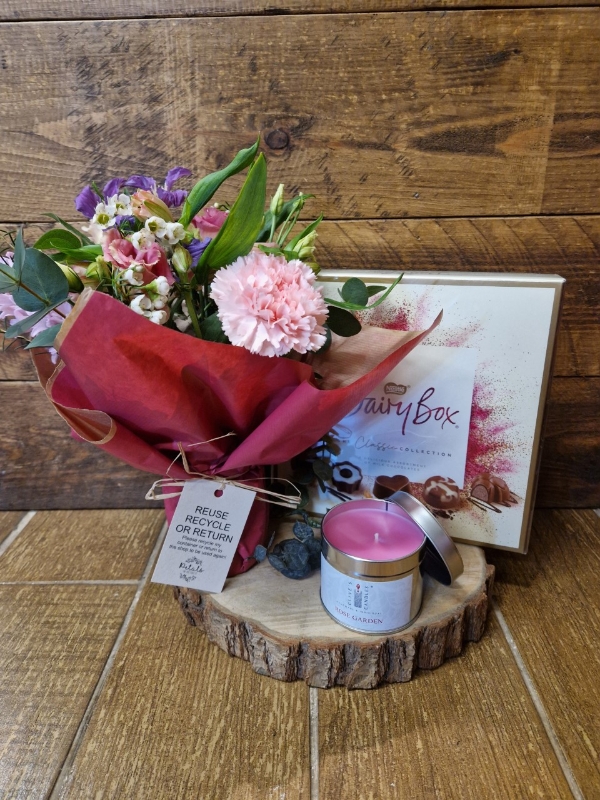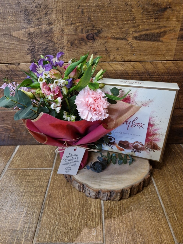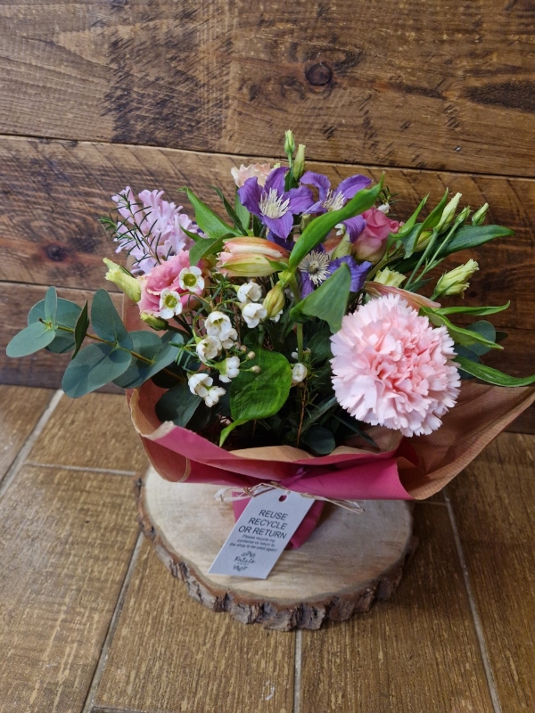 A little version of our super popular Jar design... a little jam jar wrapped in paper and filled with a few choice flowers. .... the perfect little gift! Can have extras added from our giftware
